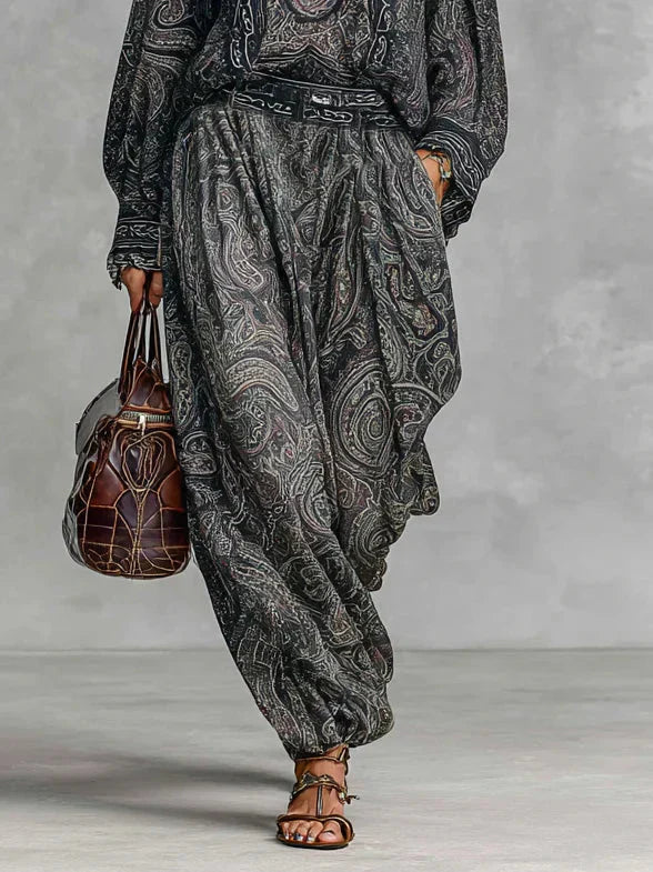 This vintage-inspired two-piece set includes a paisley-print shirt with an elegant stand-up collar and long sleeves, paired with matching trousers for a harmonious look. The relaxed fit and elegant design make it perfect for casual or semi-formal occasions.